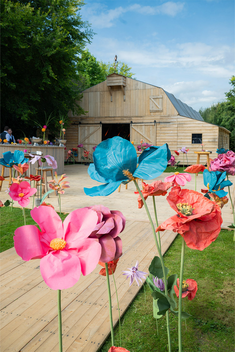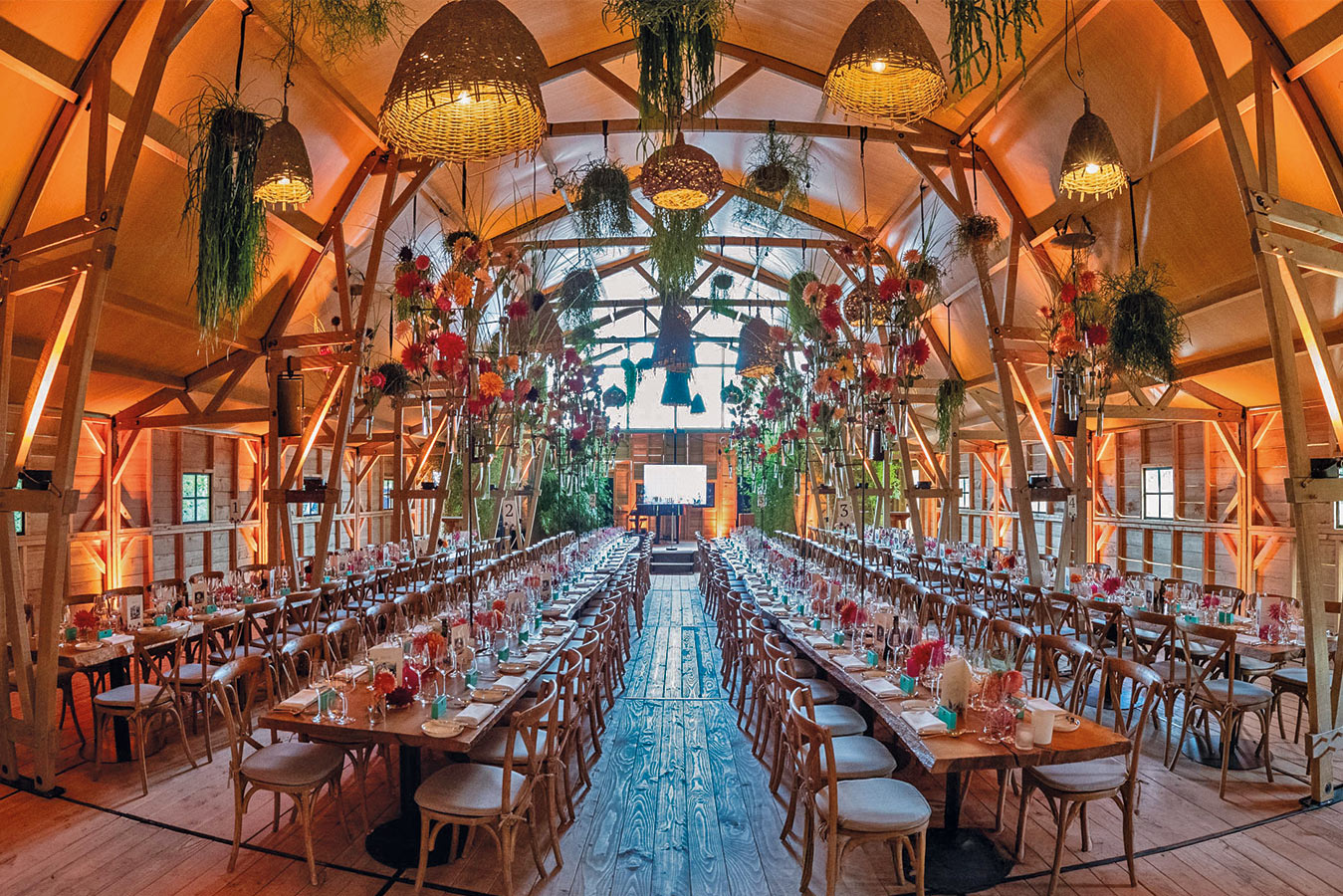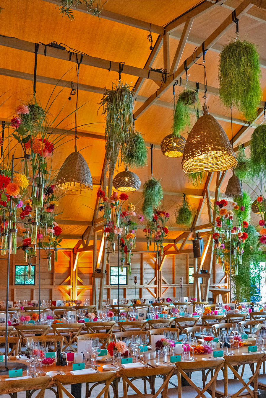 For this event, The Barn forms the backdrop of a vibrant oasis surrounded by nature. The barn's warm wood tones immediately create an inviting base, while fresh, bright colours and plenty of greenery bring the whole place to life. At the heart of the space, a long dinner table invites guests to gather. Wicker lamps and lush hanging plants float above the table, creating a natural and relaxed atmosphere. On the table, stylish uprights with colourful dahlias create a playful yet elegant image. Together, they form a festive setting where nature, colour and sophistication come together harmoniously.