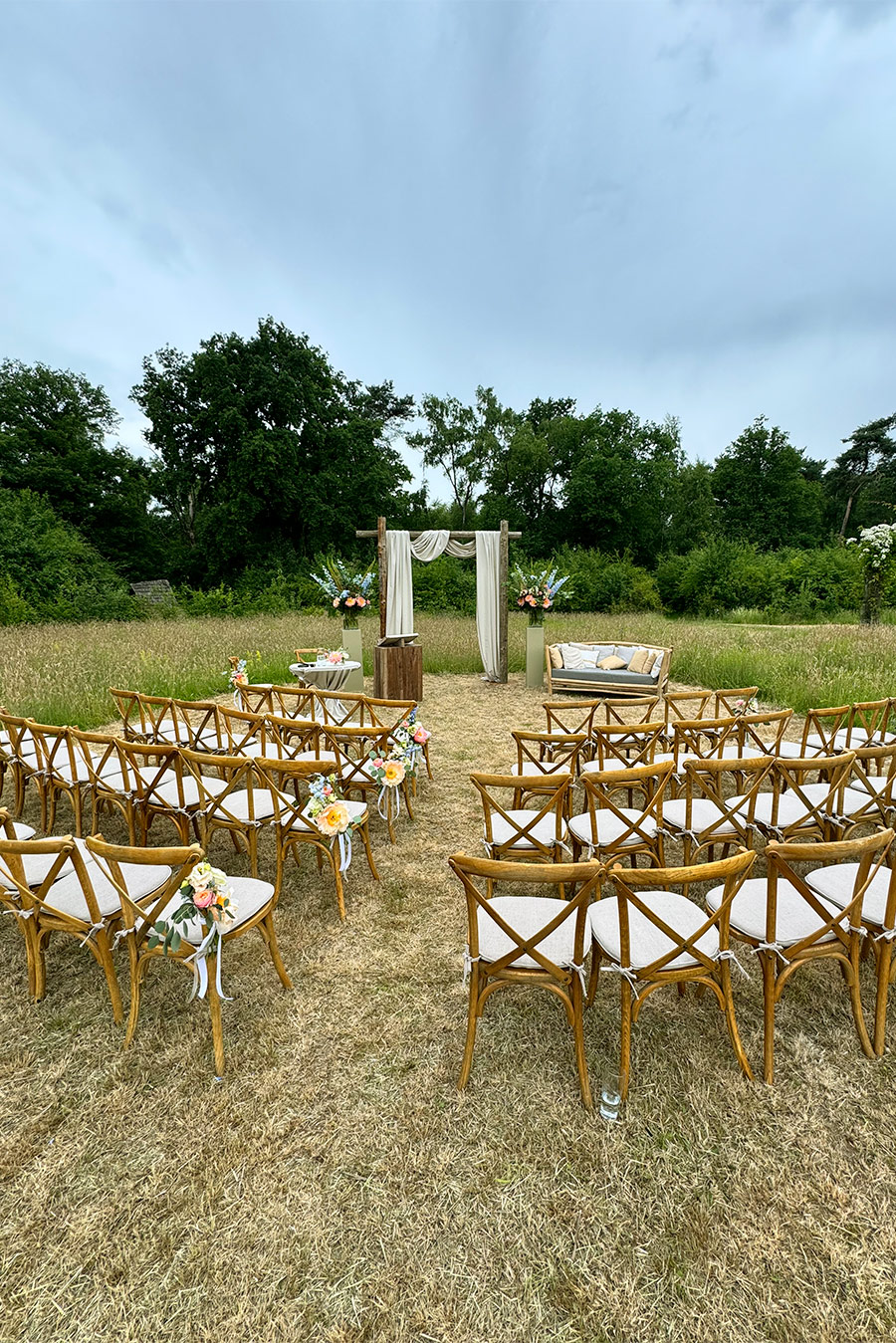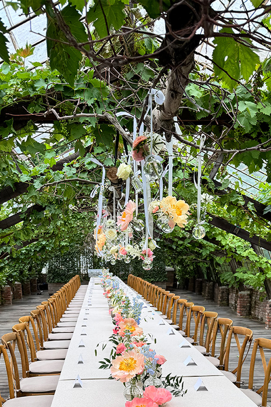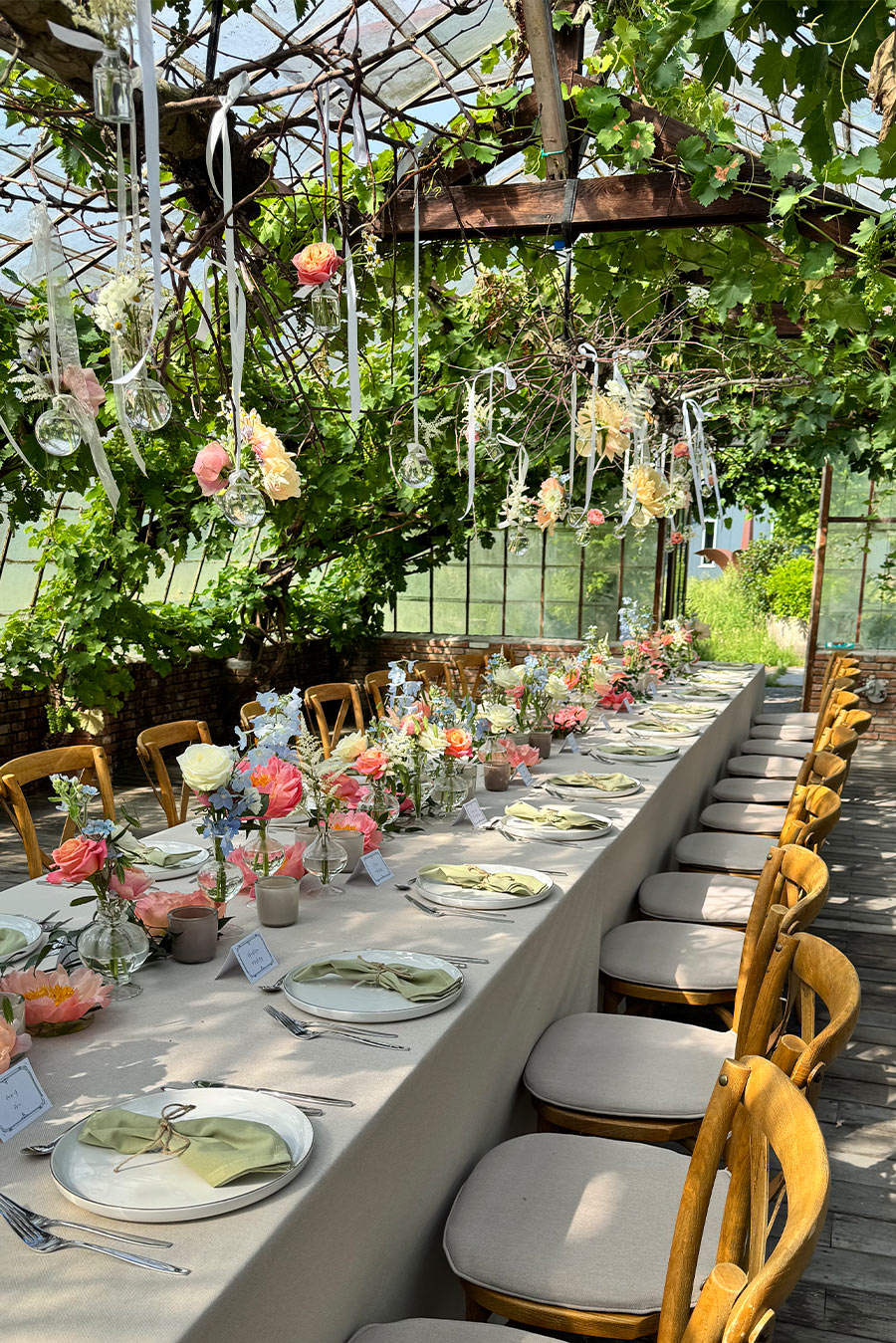 In early June, Oogenlust hosted a summer wedding in the middle of full bloom. The ceremony in the Flower Meadow was framed by warm, soft tones and natural materials, enhancing the environment in a calm and pure way. Nature was allowed to speak, in all its simplicity. The dinner was held in the Grape Greenhouse, beautifully green in June. Above the table hung a branch with small vases and flowers, a subtle eye-catcher that created a dreamy and harmonious atmosphere. A soft, colourful and enchanting whole.
