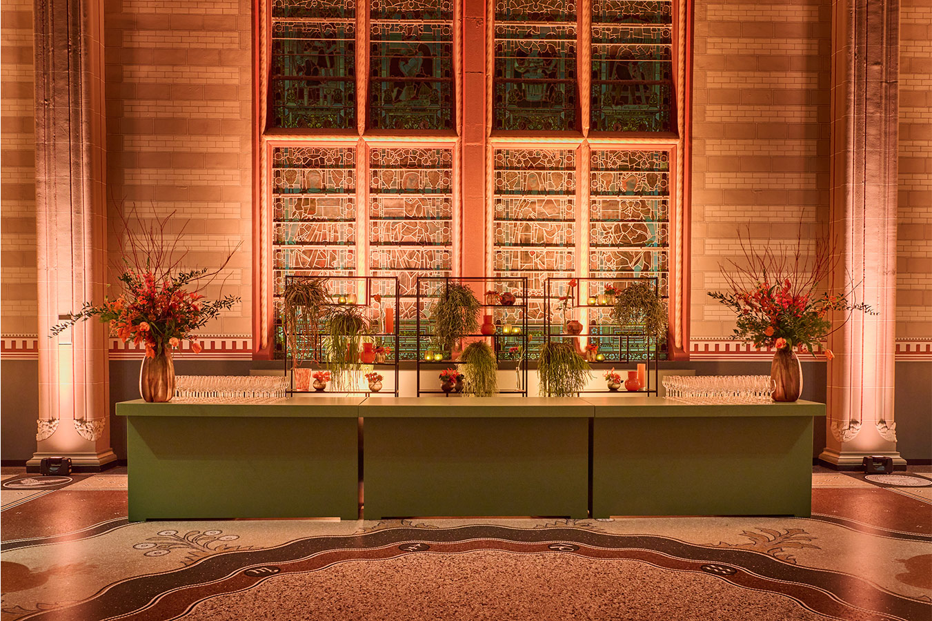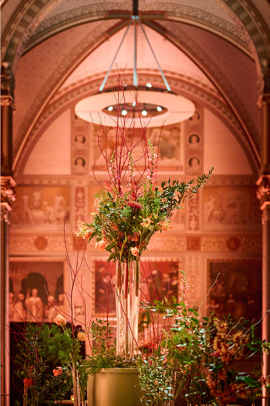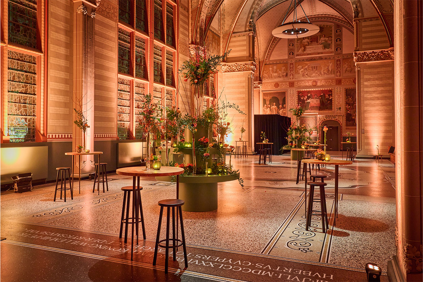 In the imposing front hall of the Rijksmuseum in Amsterdam, we realised the decoration of an exclusive summit. During this stylish walking dinner, we created a memorable and welcoming setting with colourful decoration in a colour palette of modern and earthy tones. Elegant lush floral arrangements and natural materials enhanced the characteristic elements in the space en ensured a harmonious overall experience