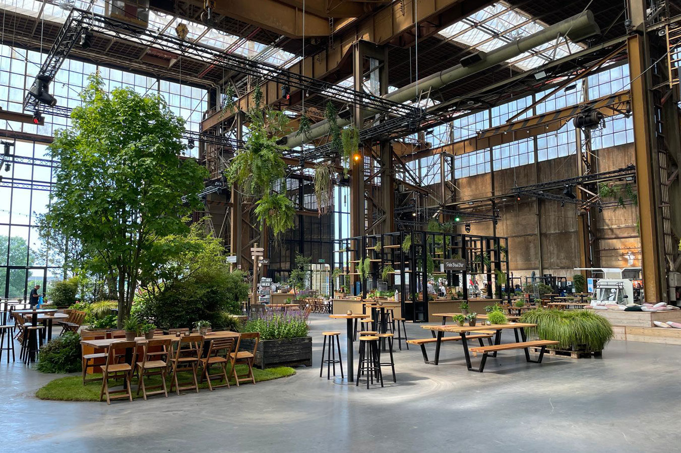 To mark the 50th anniversary of Terberg's Terminal Trekker, we are creating a green outdoor feeling in the Werkspoor cathedral in Utrecht. The industrial location will be given a natural, green look, literally bringing the outdoor feeling inside. By placing islands of plants and trees in various sizes, some up to 7 metres high. This will create a unique indoor-outdoor experience with a spontaneous, natural atmosphere. The various spaces are subtly marked with robust poles and arrows, complemented by furniture made of natural, sturdy materials that perfectly match the setting.