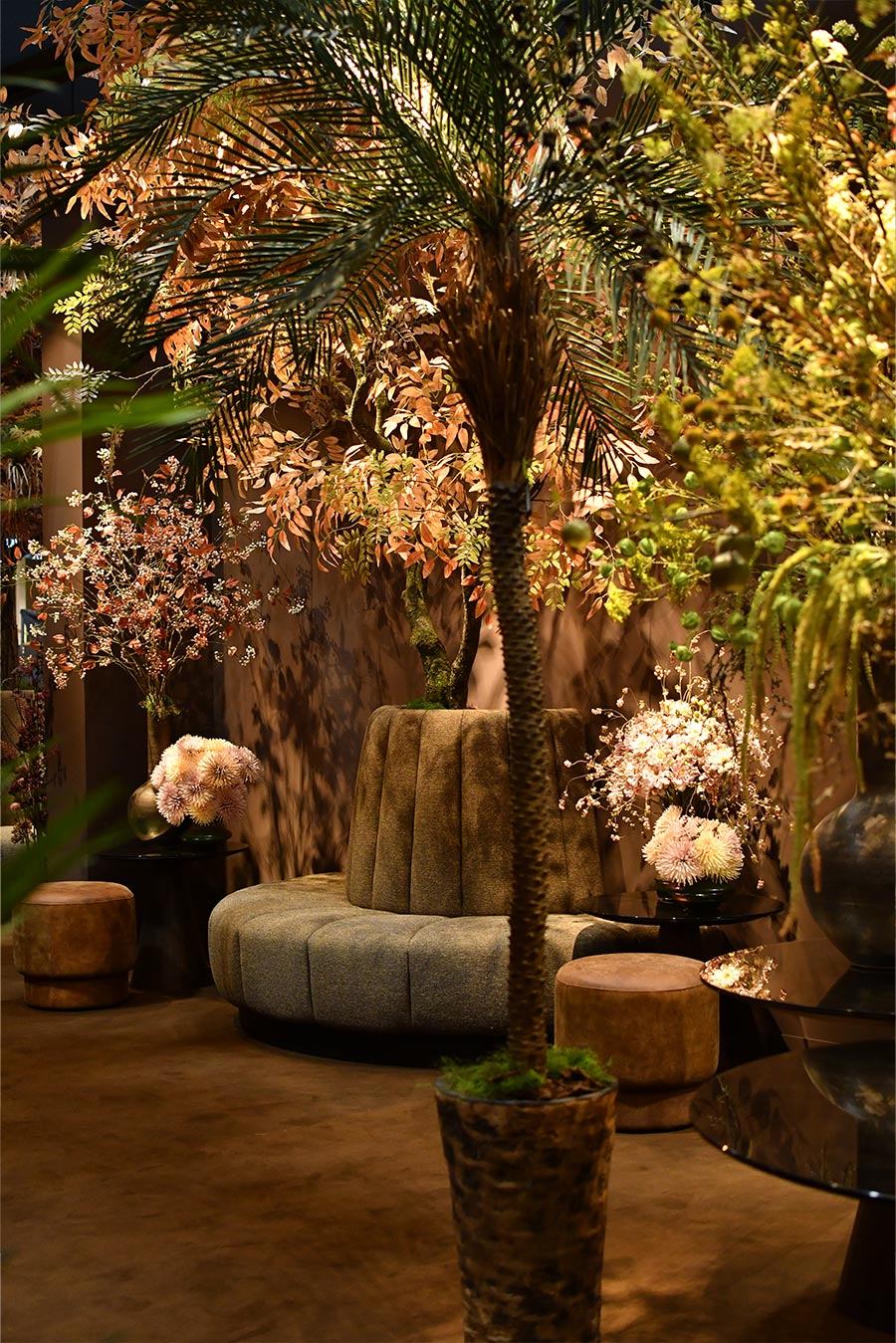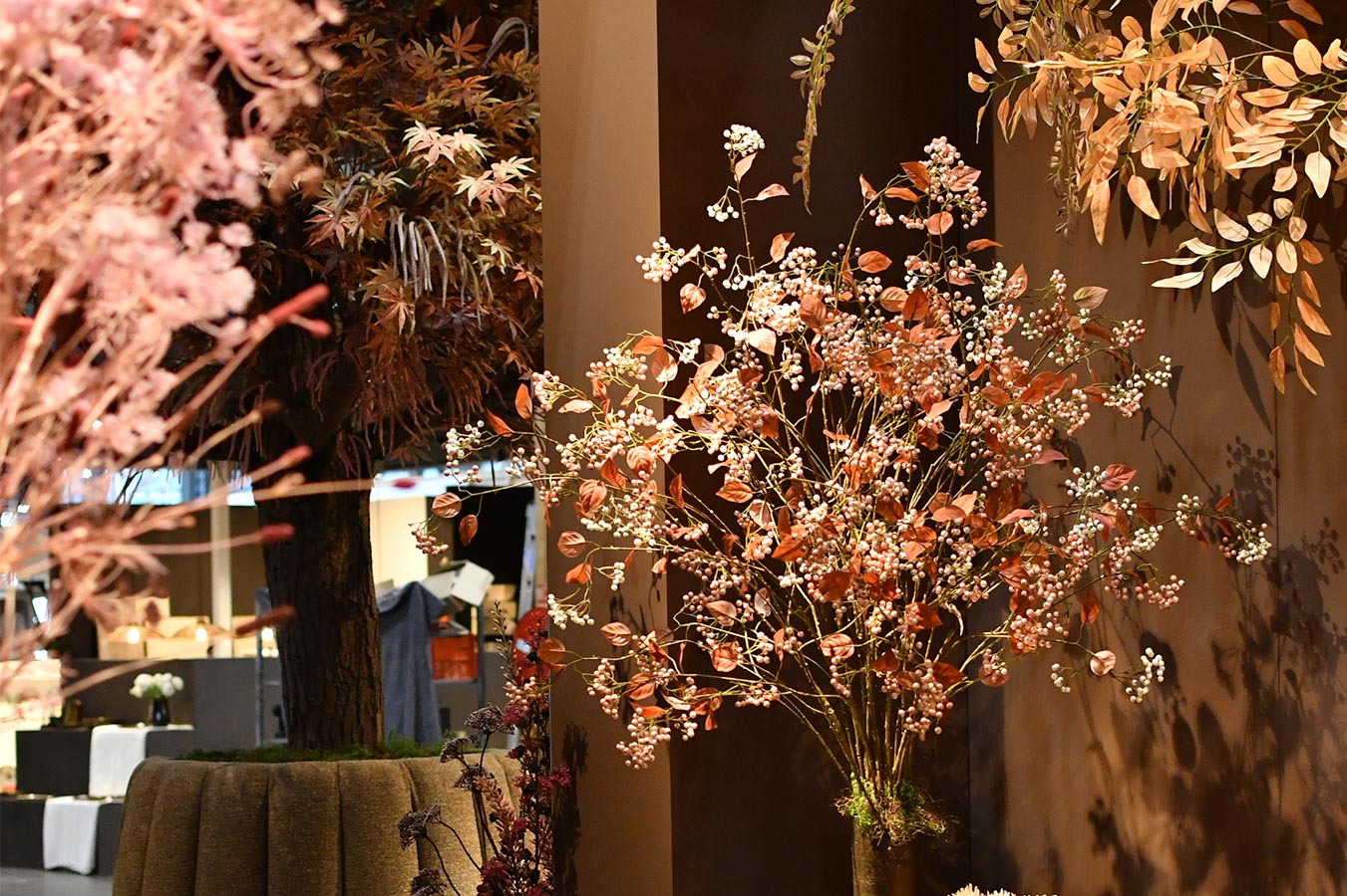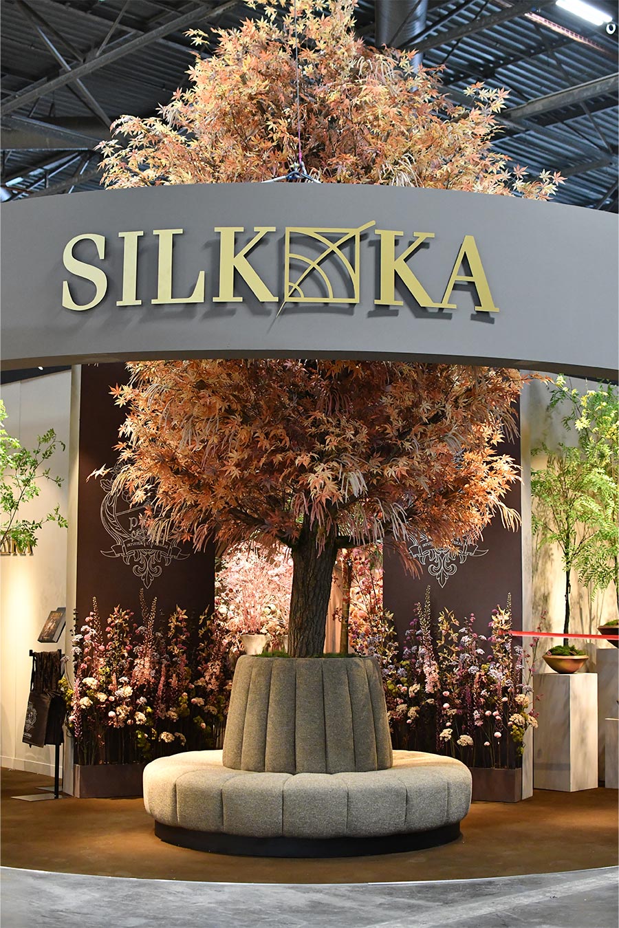 Om de materialen van Silk-ka optimaal te presenteren en context te geven, hebben we verschillende composities gemaakt. Zo stelden onze bloemisten kleurrijke en weelderige bloemstukken samen waarin tijdloze elegantie gecombineerd werd met moderne bloemenkunst. Ook vervaardigden we verschillende zijden bomen, waaronder de grote boom bij de entree van de stand, die als eyecatcher gelijk de aandacht van de bezoekers trok. Het geheel werd een betoverende en inspirerende beleving waar natuur en interieur samensmolten.